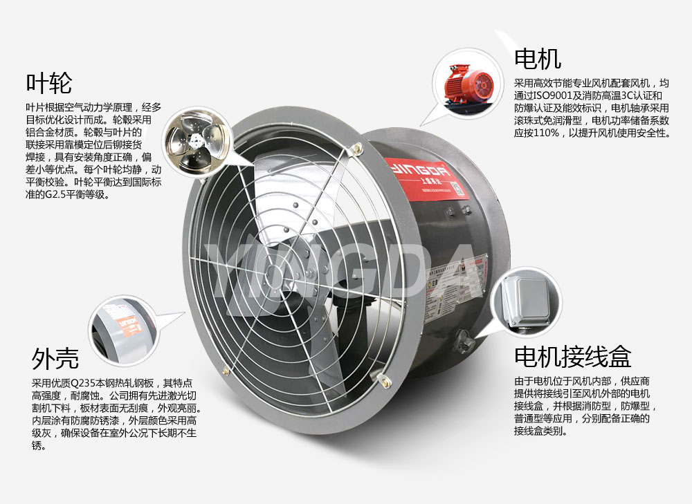 ——防爆型:電機(jī)為隔爆型、葉片為鋁合金,適用于易燃、易爆氣體的環(huán)境中,防爆等級為EXdIIBT4、EXdIICT4。